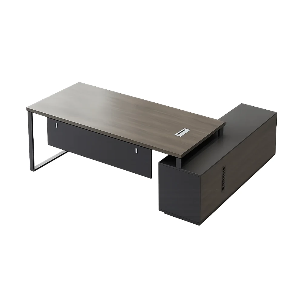 Bàn giám đốc chân sắt có tủ phụ BLV05 được thiết kế theo phong cách tối giản nhưng mạnh mẽ. Bàn chính hình chữ nhật rộng rãi, cho phép bố trí máy tính, điện thoại, tài liệu và các vật dụng văn phòng khác mà vẫn đảm bảo sự gọn gàng. Tủ phụ liền kề một bên vừa làm đối trọng, vừa đóng vai trò lưu trữ. Thiết kế này giúp chiếc bàn tạo ra sự cân bằng cả về hình khối lẫn công năng, mang lại một không gian làm việc bề thế và chuyên nghiệp cho lãnh đạo.
