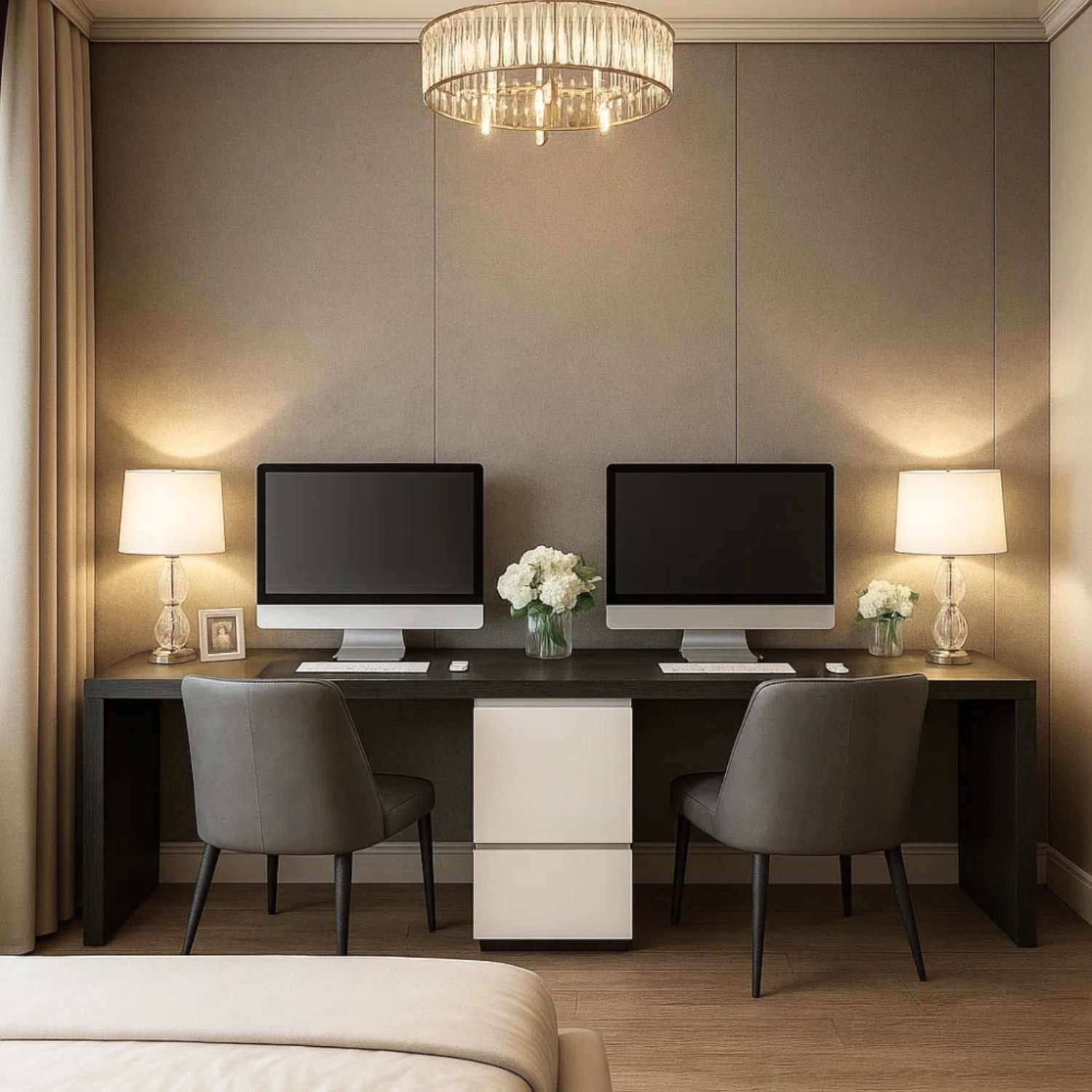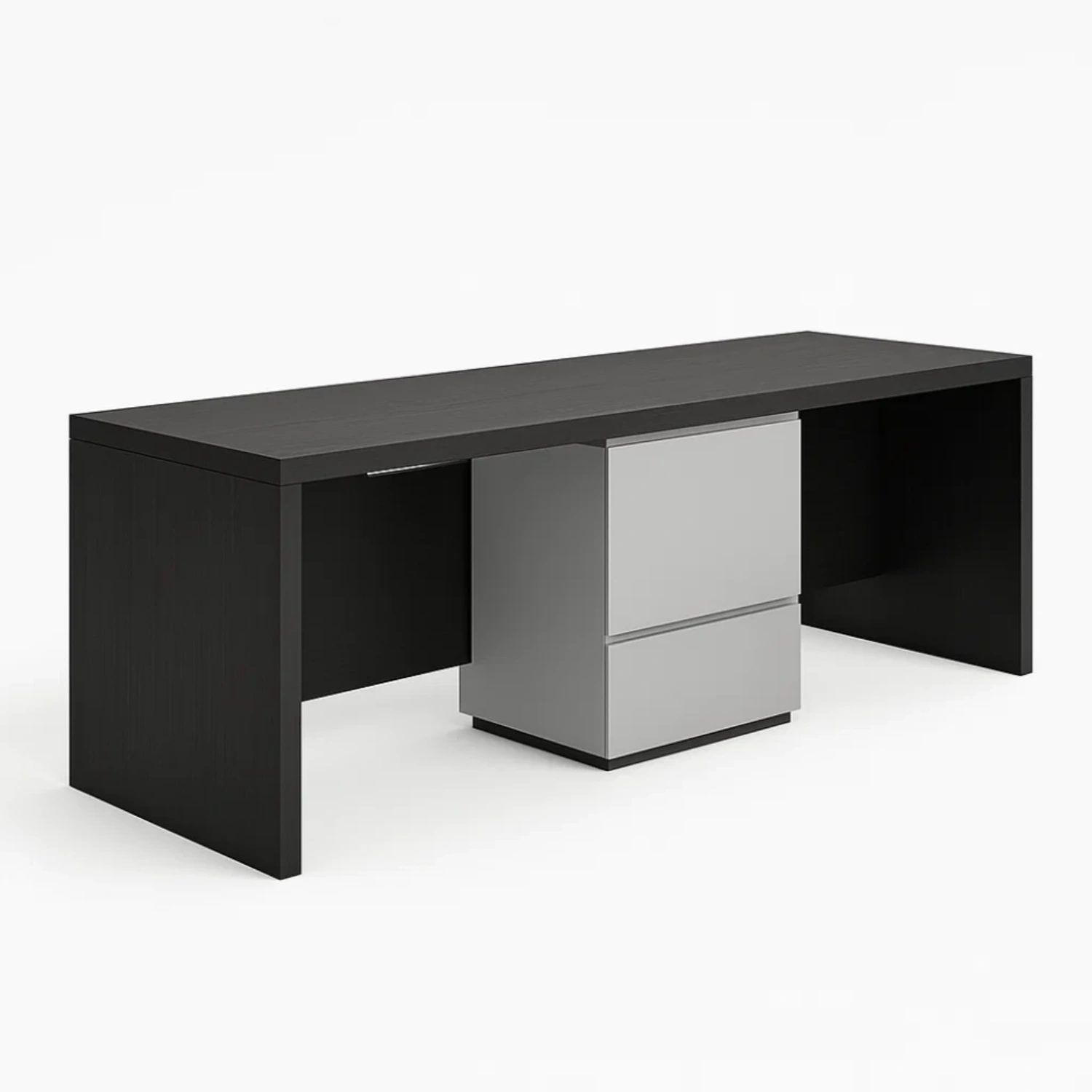 Thiết kế hai khu vực làm việc tách biệt được cân đối theo chiều dài bàn. Mỗi bên đủ rộng để bố trí laptop, sổ tay, đèn bàn và các vật dụng cá nhân. Giữa bàn là hệ ngăn kéo chia đều – vừa tiết kiệm diện tích, vừa tăng hiệu quả lưu trữ.